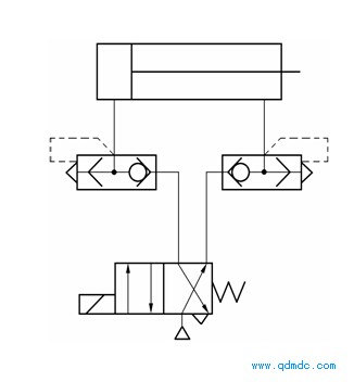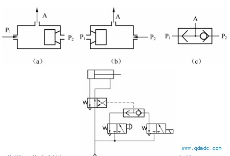 (2)梭阀。两个单向阀的组合,其作用相当于“或门”。