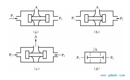 (3)双压阀。两个单向阀的组合,其作用相当于“与门”。