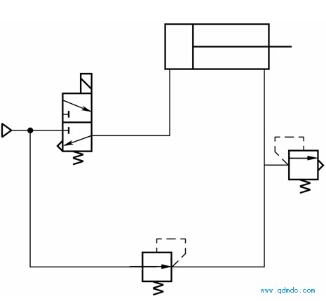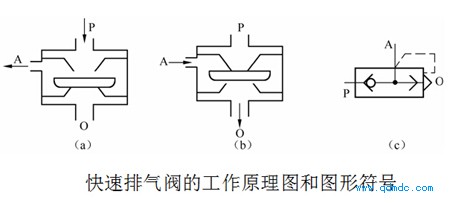 (4)快速排气阀。快速排气阀常装在换向阀和气缸之间,它使气缸不通过换向阀而快速排出气体,从而加快气缸的往复运动速度,缩短工作周期。